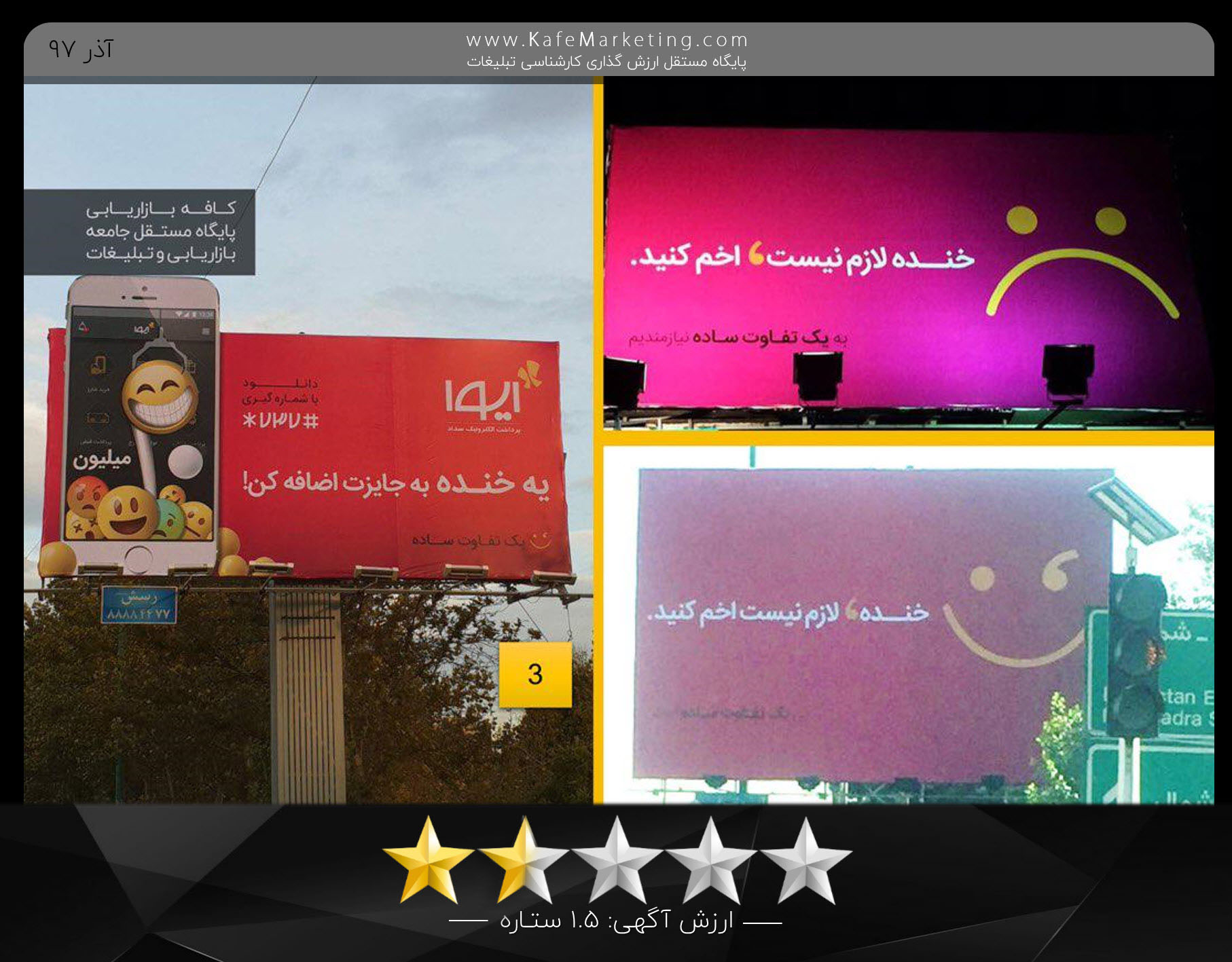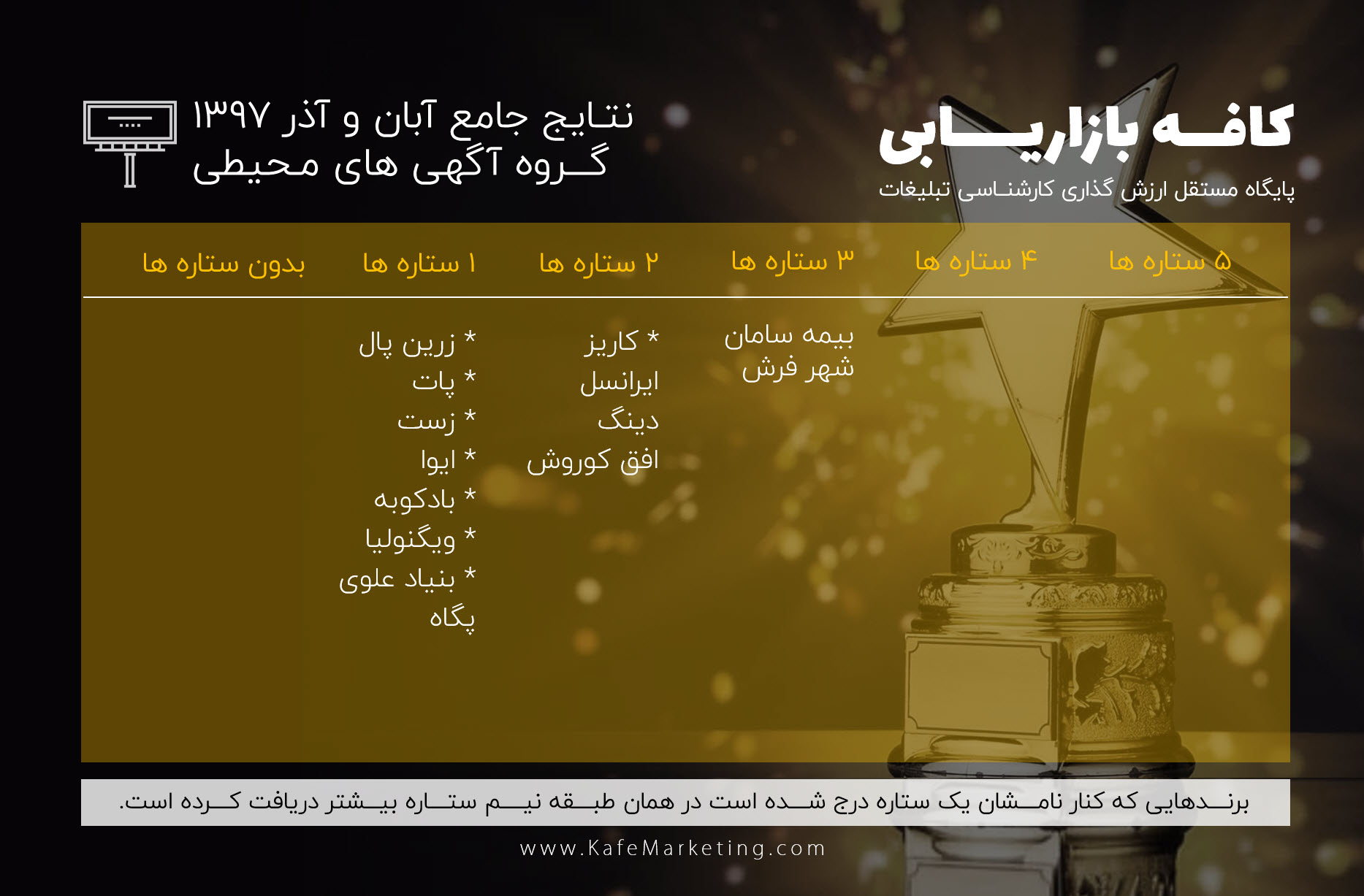 همان طور که در کانال تلگرام کافه بازاریابی شاهد بودید در کافه بازاریابی رتبه بندی و ارزش گذاری آگهی های شروع شد و انعکاس خوبی هم نزد اهالی فن و متخصصان داشت. پیامهای متعدد شما بعد از شروع این حرکت ما را بر آن داشت تا از نحوه ارزش گذاری گزارشی ارایه دهیم که پیش از این در سایت خواندید (اینجا) حالا می توانید نتیجه ارزش گذاری ویژه آبان و آذرماه را یکجا ببینید. لازم به ذکر است. برای دیدن لحظه به لحظه ارزیابی ها نیز با کانال ما همراه باشید.