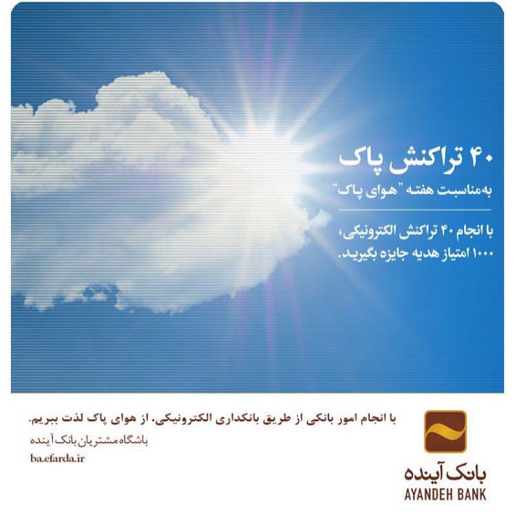 برندها در تلاش برای هوای پاک و کاهش هزینه ها هستند بانک آینده با پیام انجام امور بانکی از طریق خدمات الکرتونیک همه را تشویق به لذت بردن از هوای پاک می کند. بانک آینده به مناسبت هفته هوای پاک، تراکنشهای پاک را وارد قرعه کشی میکند. این برنامه با عنوان ۴۰ تراکنش پاک اجرا می شود. به نظر می رسد در فضای کاملا شعاری برندها به مناسبت این روز، این پیام را بیشتر می توان باور کرد.