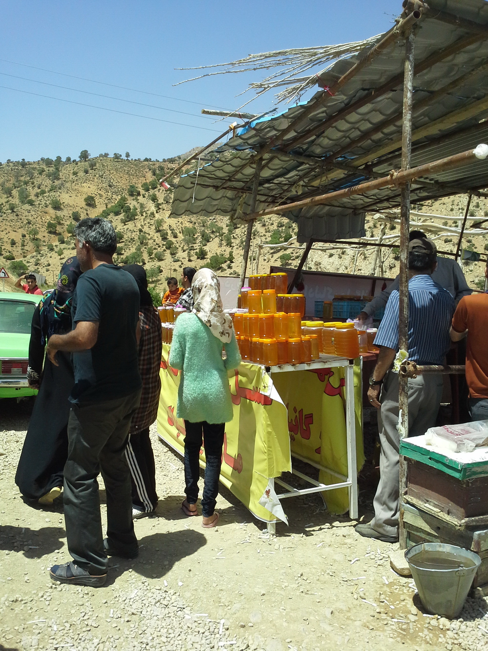 نمونه ايي ديگر رو كه در ميان طوايف بختياري ديدم نيز جالب بود اما در اينجا شخصي كارآفرين و تحصيلكرده اقدام به اين كار كرده بود البته از همان خطه.از چندين كيلومتر پيش از رسيدن به اين مكان تابلوهايي ديده مي شد كه نوشته شده بود ” عسل رايگان” . وقتي به آن مكان مي رسيدي يك تراكت تبليغاتي با توضيحاتي در زمينه خواص عسل و شماره پيامكي كه پيشنهادات و انتقادات و سوالات شما در زمينه عسل رو پاسخ مي داد و سپس تست عسل به صورت رايگان بود.در كنار اين ها در اون جاده شخصي در لباس خرس نيز ديده مي شد كه اين هم براي فروش در روستا جاي تحسين داره.(اما خوب متاسفانه باز هم مشكلات زيست محيطي ناديده گفته شده بود)(در زير عكس ها را ملاحظه مي كنيد)