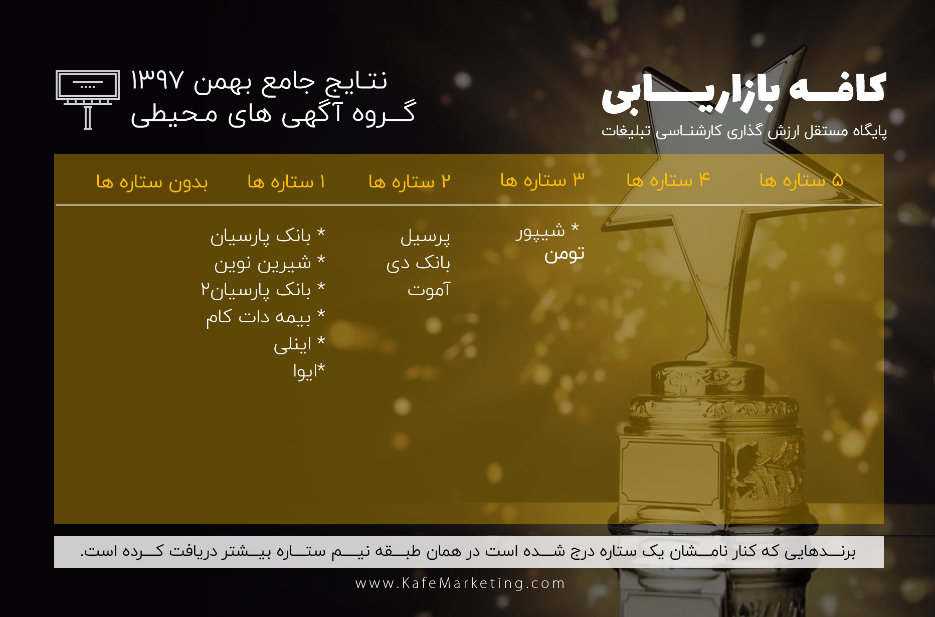 همان طور که در کانال تلگرام کافه بازاریابی شاهد بودید در کافه بازاریابی رتبه بندی و ارزش گذاری آگهی های شروع شد و انعکاس خوبی هم نزد اهالی فن و متخصصان داشت. پیامهای متعدد شما بعد از شروع این حرکت ما را بر آن داشت تا از نحوه ارزش گذاری گزارشی ارایه دهیم که پیش از این در سایت خواندید (اینجا) حالا می توانید نتیجه ارزش گذاری ویژه بهمن را یکجا ببینید. لازم به ذکر است. برای دیدن لحظه به لحظه ارزیابی ها نیز با کانال ما همراه باشید. این ماه آگهی برتر نداشتیم.