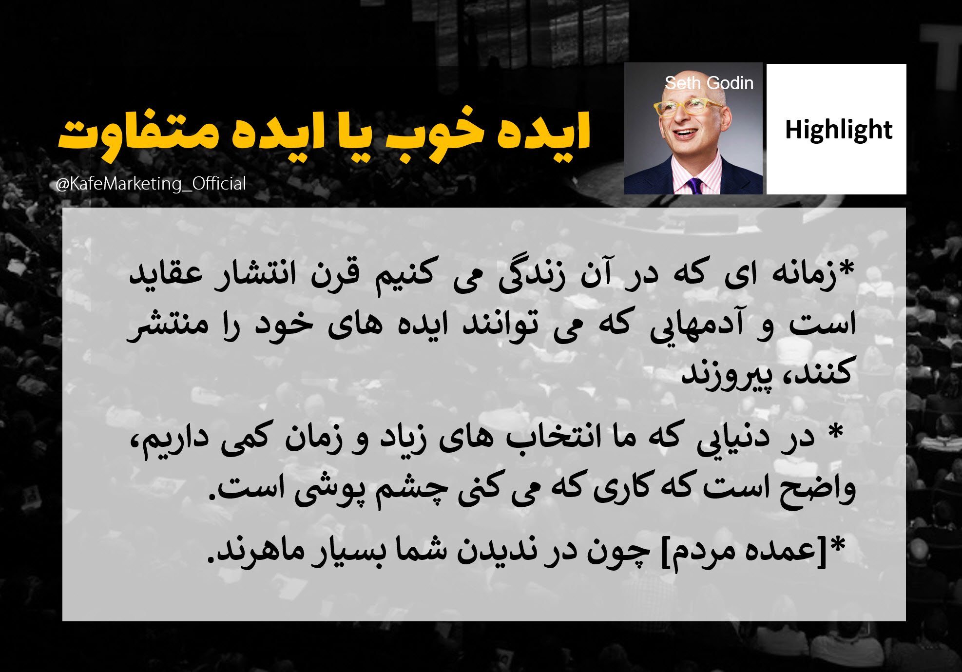مثل دیالوگ معروف بودن یا نبودن مسئله این است همیشه با خودم این جمله رو زمزمه می کنم که ایده ی خوب یا ایده متفاوت مسئله این است . برای من مثل روز روشنه که ایده باید دیده بشه پس چرا خیلی از ایده ها که به نظر اهل فن خوب به نظر میاد توسط مردم دیده نمیشه ! و یا چرا گاهی ایده های بد به معنی واقعی کلمه بد ! دیده میشن !!؟ آیا ایده خوب ایده ی متفاوت است ؟! تفاوت به چه قیمتی ؟ آیا تعریف دیگه ای برای تشخیص ایده کارگشا وجود داره؟ آقای گادین سیر زیادی در مباحث ایده پردازی و خلاقیت داشته و چند تا کتاب هم در این زمینه نوشته. شاید مهمترین کتاب ایشان گاو بنفش باشد که درایران نیز به چاپ رسیده. او در این سخنرانی به ما می گوید در جهانی با انتخاب های بسیار زیاد و فرصت بسیار کم، انتخاب بدیهی ما چشم پوشی از چیزهای عادی است.سایت تد از او به عنوان مرشد بازاریابی نام می برد . «ست گادین» در این سخنرانی می گوید که چرا وقتی که هدف جلب توجه ماست، ایده های بد یا عجیب موفق تر از ایده های خسته کننده اند!