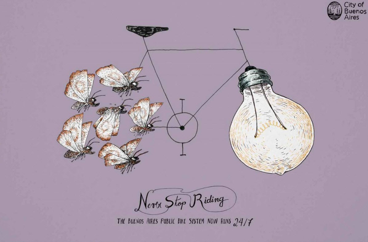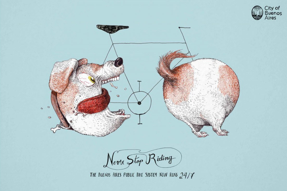 خلاصه ایده: برنامهی دوچرخهسواری پایتخت کشور آرژانتین تا همین اواخر از ساعت ۸ صبح شروع می شد و در ساعت ۸ شب پایان میپذیرفت .اما امسال، شهرداری بوینسآیرس، این خدمات را به صورت ۲۴ ساعته شبانهروز و در ۷ روز هفته ارائه کرد. بنابراین برای ترویج خبر میان ساکنان این شهر، انجمنی (سابقاً بهنام انجمن LA شناخته میشدند) از این نکته استفاده کردند و با استفاده از به نمایش گذاشتن نسخههای چاپی و کمپین تبلیغاتی خارج از خانهی ) با شعار “همیشه در حال سواری، توقف ممنوع″)، سعی کردند تا طبیعت دائم و بیوقفهی این خدمات را به نمایش بگذارند. در این کمپین با شخصیت دادن به چرخهای دوچرخه، به صورت ترکیبهای مفهومی مرتبط با یکدیگر به صورت سگ و دمش، سنجاب و فندق و …طرحهای جالبی ایجاد شد.