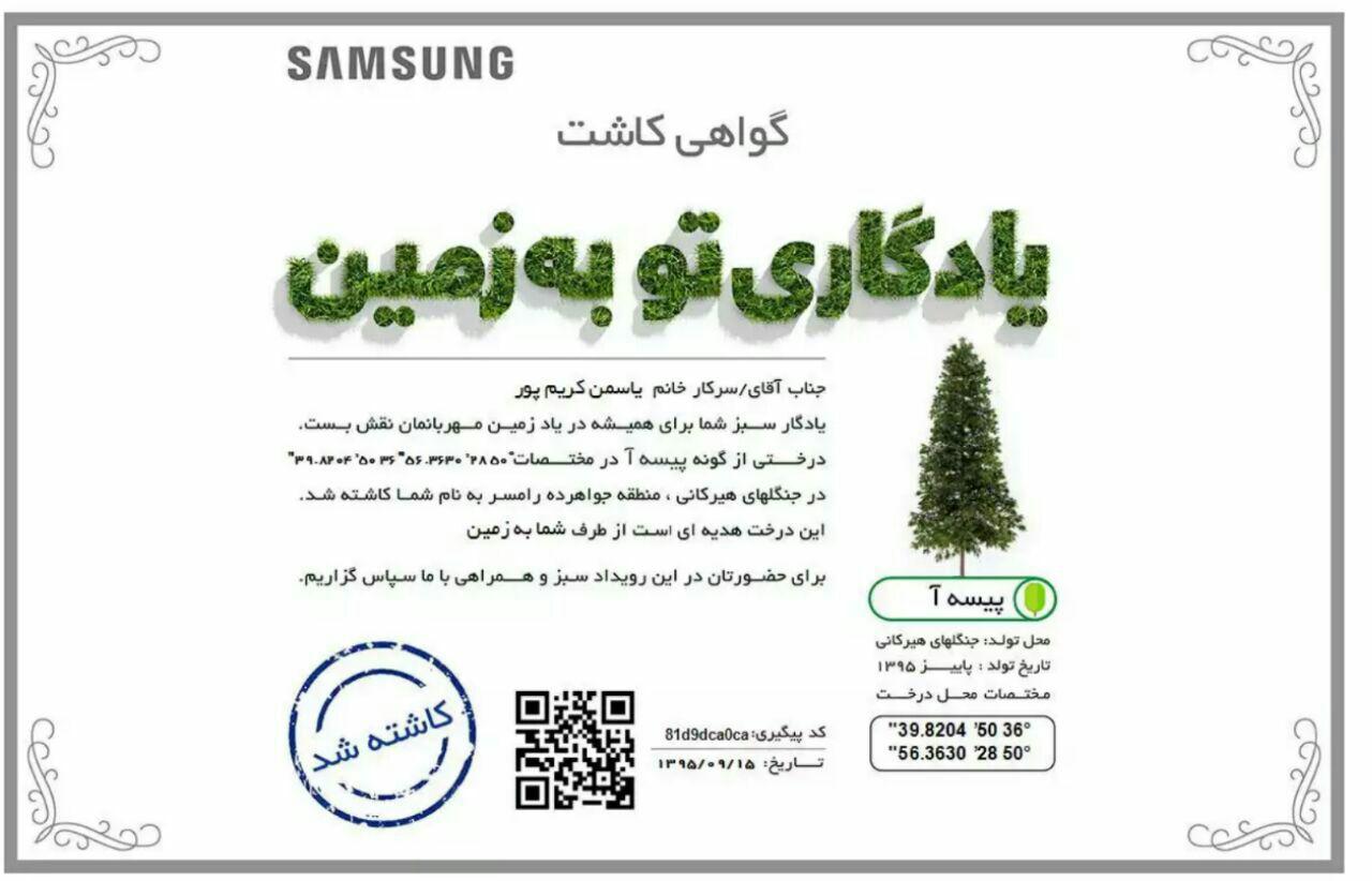 بعد از خرابکاری های اخیر سامسونگ در تولید گوشی موبایل سامسونگ کمپینی با عنوان “یادگاری تو به زمین ” را راه انداخت که به زعم خیلی ها یک کارناوال تبلیغاتی و بدون تعهد در اجرا بیش نبود. اما حالا سامسونگ اطلاع رسانی دقیقی از عملکرد خود نیز در این کمپین کرده است. اطلاع رسانی دقیق به معنای واقعی کلمه. سامسونگ مشخصات درخت کاشته شده برای همراهان کمپین یادگاری تو به زمین را ارسال می کند. درخت کاشته شده در کمپین سامسونگ را می توانید بر روی نقشه ببینید! صدور یک گواهی واقعی کاشت برای همراهان کمپین یادگاری تو به زمین نیز ارسال می شود. این یعنی مصداقی از پایبندی برند به گفته هایش!