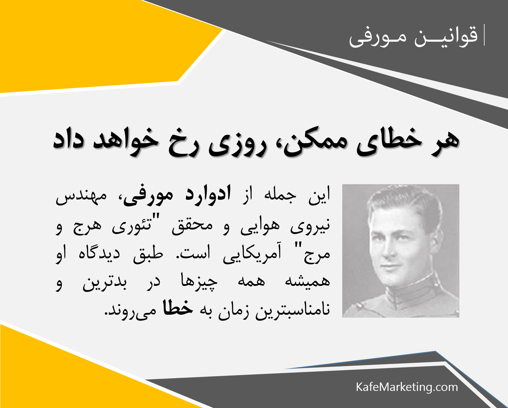 یک مثل رایج در غرب است که میگوید «هر خطای ممکن رخ خواهد داد.» این جمله از ادوارد مورفی مهندس نیروی هوایی و محقق «تئوری هرج و مرج» آمریکایی است. طبق این زبانزد همیشه همه چیزها در بدترین و نامناسبترین زمان به خطا میروند و کارها را لنگ میگذارند. معمولاً هنگامی که شخصی همواره بدشانسی میآورد او را مشمول قانون مورفی مینامند.