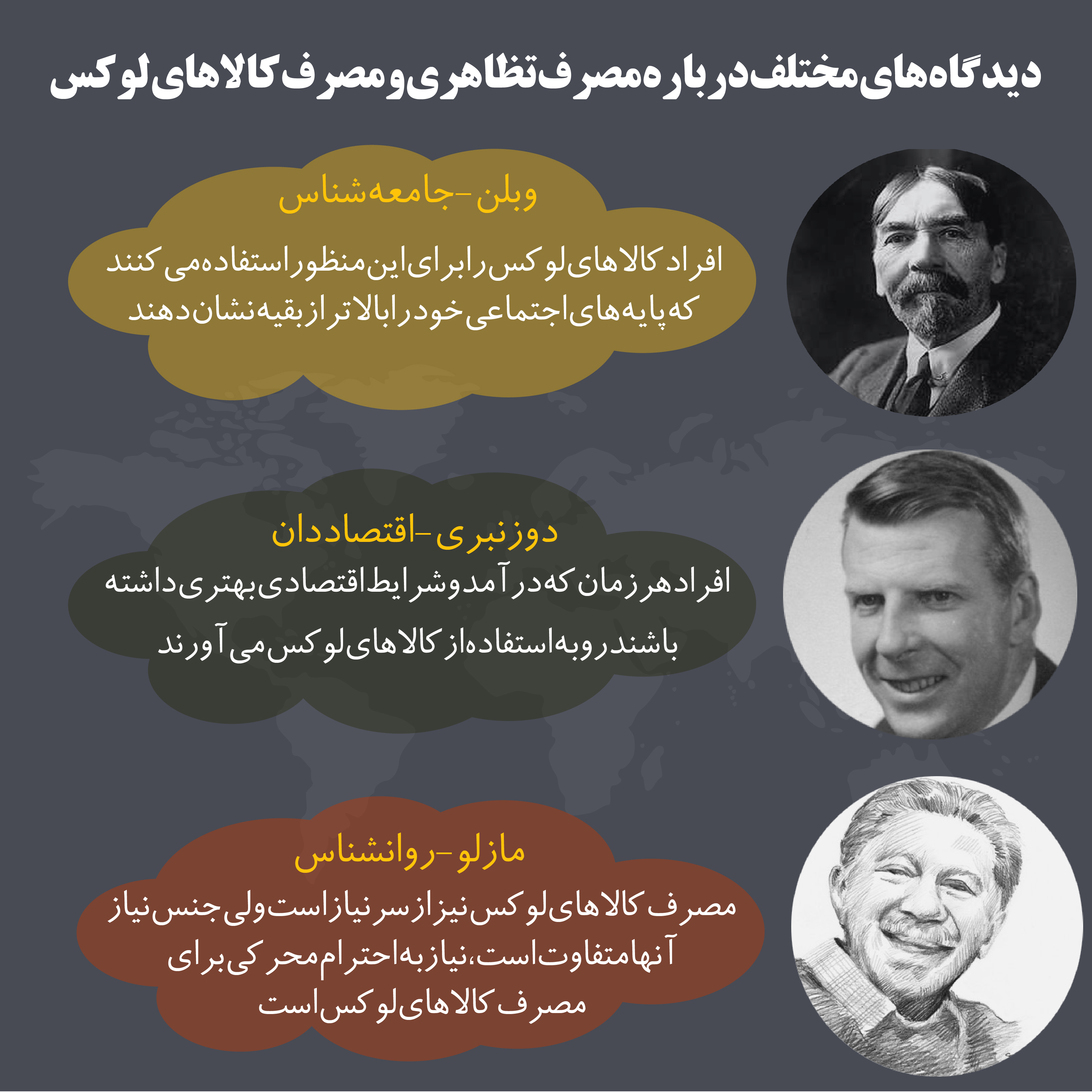 وبلن جامعه شناسی آمریکایی بود و اعتقاد داشت که افراد کالاهای لوکی را مصرف می کنند نه به خاطر اینکه به این کالا ها نیاز دارند، بلکه هدف آنها بالاتر نشان دادن پایه های اجتماعی خود می باشد. جیمز دوزنبری اقتصاد دانی بود که اعتقاد داشت با بالاتر رفتن سطح درآمد افراد انتظارات شخصی و محیطی افراد نیز بالاتر می رود و رفاه اقتصادی است که باعث مصرف کالاهای لوکس می شود، مازلو روانشناسی بود مصرف کالاهای لوکس را با هرم سلسله مراتب نیاز های خود توجیه کرد و بیان داشت که بر خلاف نظر وبلن که مصرف کالاهای لوکس را از سر نیاز نمیدانست، مصرف این کالاها از سر نیاز است، اما جنس اسن نیاز متفاوت است و در واقع نیاز به احترام که سطح چهارم نیاز های هرم مازلو است پوشش دهنده این نوع رفتار جامعه است.
