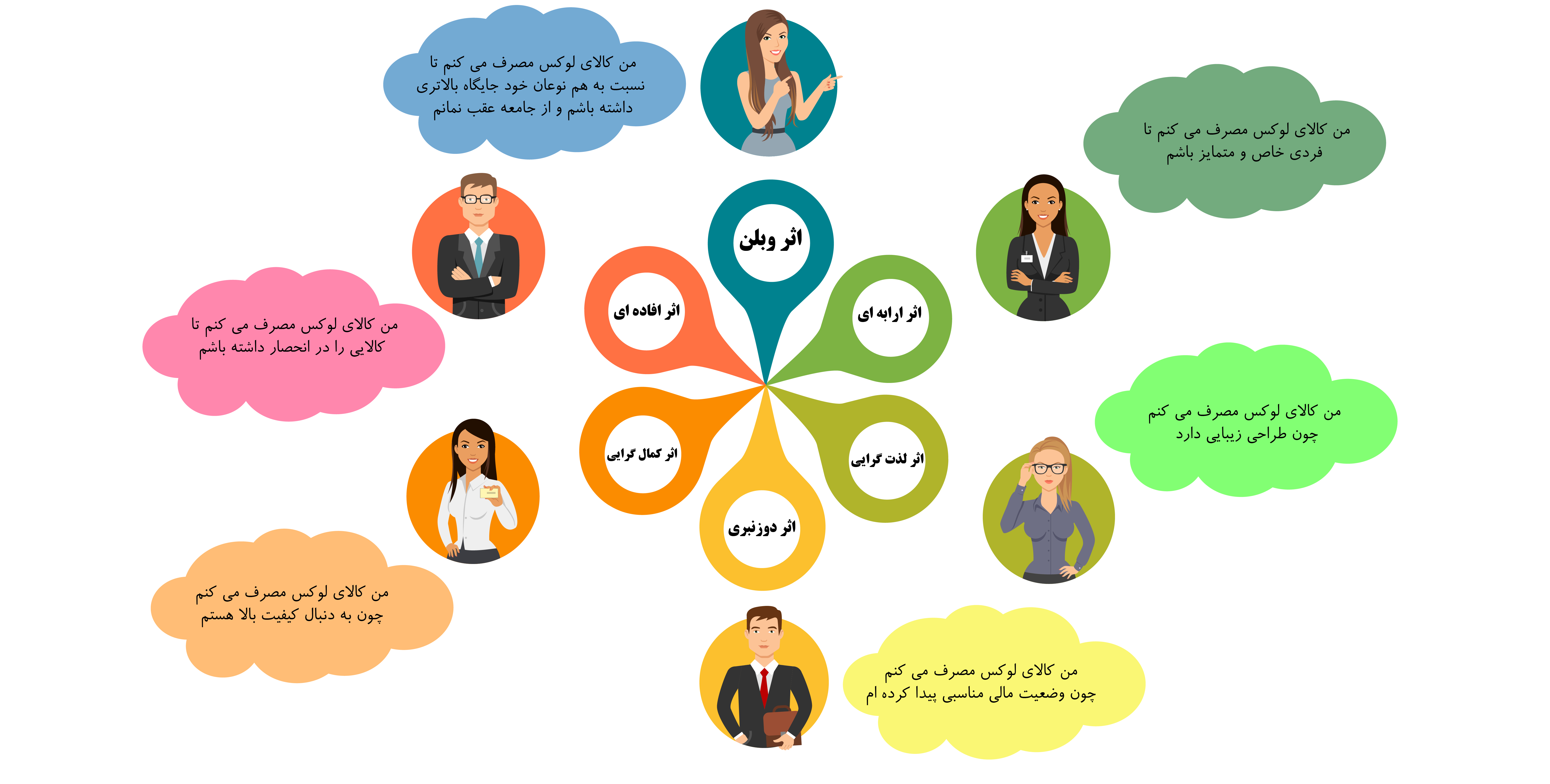 اثر وبلن یا Veblen effect : این اثر مبنایی محیطی و اجتماعی دارد و افراد از سر چشم و هم چشمی به خرید کالاهای لوکس می پردازند که در درجه اول نسبت به طرف مقابل خود یکسان باقی بمانند و در درجه دوم خود را فردی بالاتر از نظر اجتماعی جلوه دهند.