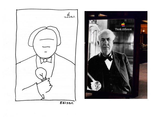 ایده دیگری که به ذهن من رسید از داستان گوزن های ستاره دار دکتر Seuss بود. در این داستان گوزن هایی با داشتن ستاره ای بر روی بدنشان، در میان جمعیت گوزن های بی ستاره متفاوت و خاص بودند و سایر گوزن های بی ستاره برای ستاره دار شدن و خاص بودن به فردی مراجعه می کردند که به ازای دریافت ۳ دلار آن ها را ستاره دار می کرد. ایده اصلی این داستان که بر مبنای خاص و متفاوت بودن عده ای از افراد جامعه بنا شده بود، ناگهان عبارتی را در ذهن من زنده کرد. شروع به کشیدن لوگوی اپل کردم و عبارت متفاوت فکرکن Think different را زیر آن نوشتم. روزهای قبل در طرف دیگری از دفترچه یادداشتم تصویری از ادیسون را کشیده بودم. لوگوی اپل و عبارت «متفاوت فکر کن» را بالای سر او ترسیم کردم و در نهایت طرحی که به وجود آمده بود به شدت مرا به وجد آورد. مدتی به این طرح و و عبارتی که بالای آن نوشته بودم فکر کردم. اینکه ادیسون چگونه با افکار خود دنیا را تغییر داد.