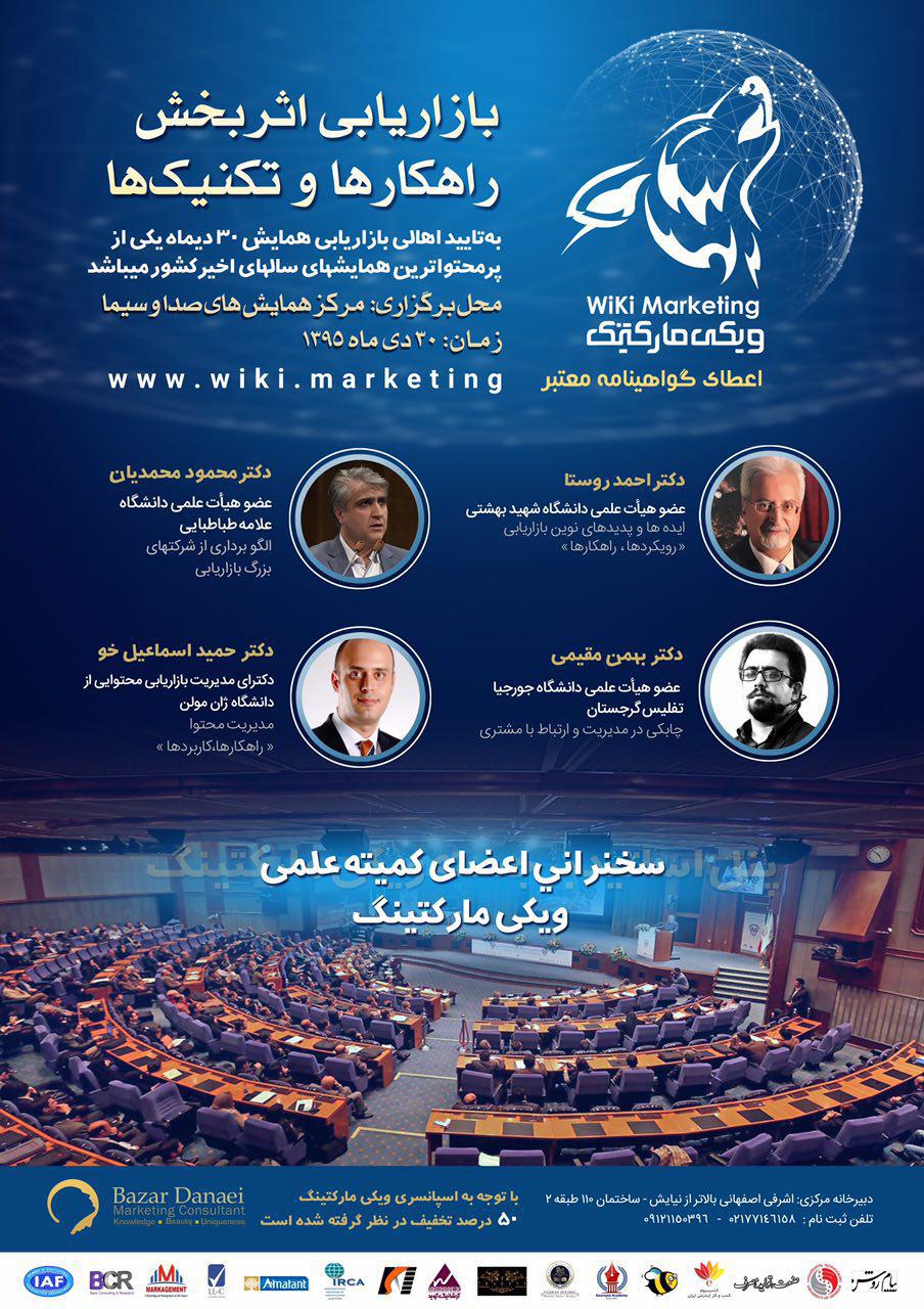همایش “بازاریابی اثربخش راهکارها و تکنیک ها” در تاریخ ۳۰ دی ماه در مرکز همایش های صدا و سیما برگزار خواهد شد.علاقه مندان می توانند در این همایش به صورت انلاین ثبت نام کنند. (برای ثبت نام انلاین اینجا کلیک کنید) این همایش با حضور اساتید برجسته بازاریابی و به همت گروه ویکی مارکتینگ برگزار خواهد شد. اطلاعات بیشتر را در همین سایت پیگیر باشید.