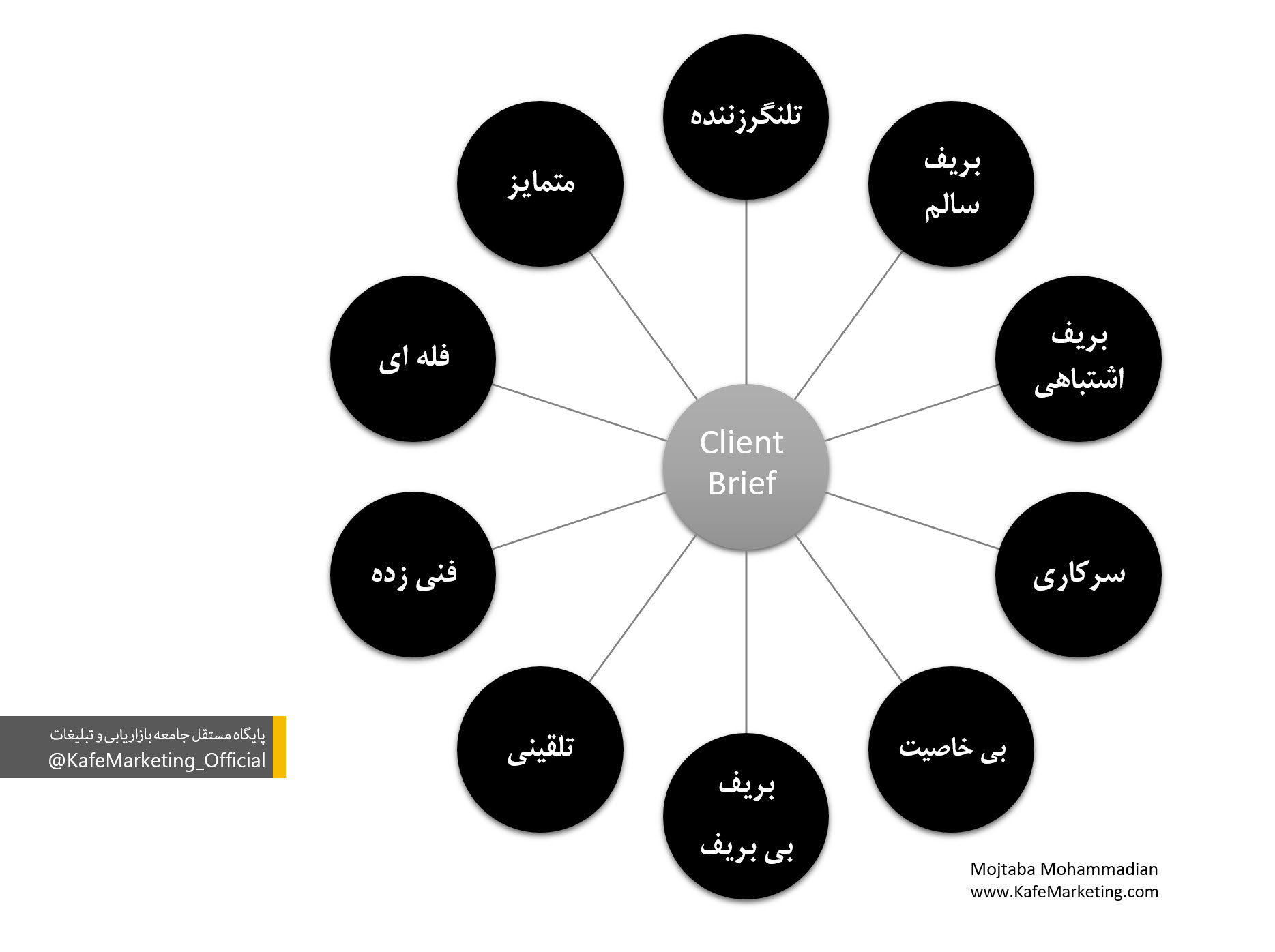 بریف های فله ای: مشخصا کسانی که با خودروسازان (الزام خودروسازان ایرانی نه، بلکه خودروسازان چینی هم به این گروه اضافه شده اند) کار کرده اند می دانند که بریف های فله ای یعنی چه. بریف های فله ای زمانی اتفاق می افتد که برای شما به عنوان بریف، یک جزوه ۳۰ صفحه ای ایمیل می کنند که از A تا Z محصول در آن نوشته شده و از شما می خواهند خودتان محتوای بریف را از آن استحراج کنید. اینجا، این شما هستید که باید به طور خودجوش تعیین استراتژی و نوشتن بریف را به عهده بگیرید. البته در صنایع دیگر هم این نوع بریف دیده شده است. مصیبت دقیقا اونجاست که شما بعد از انجام کار تازه با خواسته های مشخص مشتری مواجه می شوید که می گوید فلان چیز را بگو فلان چیز را نگو.