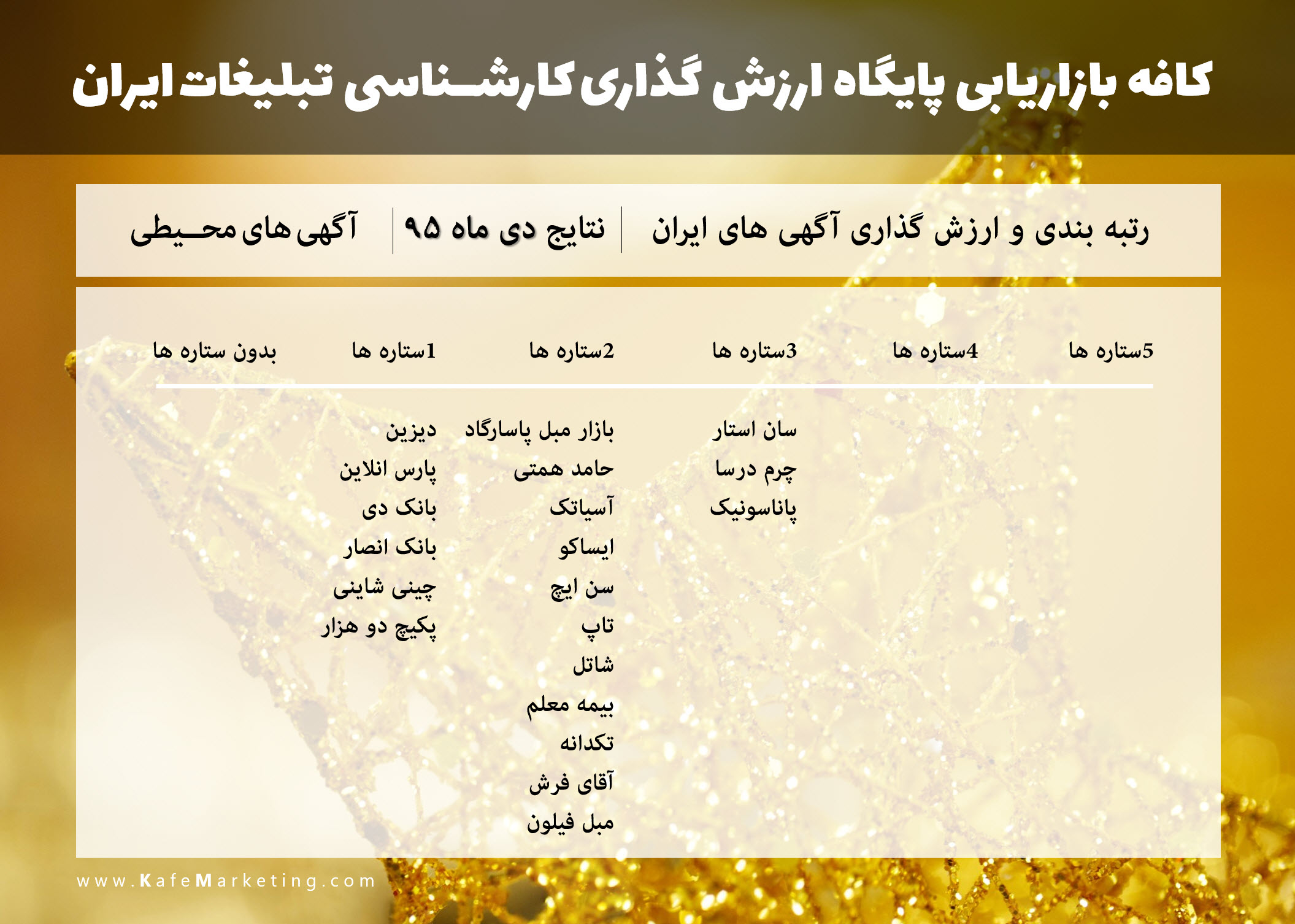 حالا با هم ضمن دیدن جدول نهایی دی ماه، آگهی های ارزش گذاری شده دی ماه را به ترتیب ببینیم. ان شالله تا پایان سال بهترین آگهی ها به نظرسنجی عموم گذاشته خواهد شد.