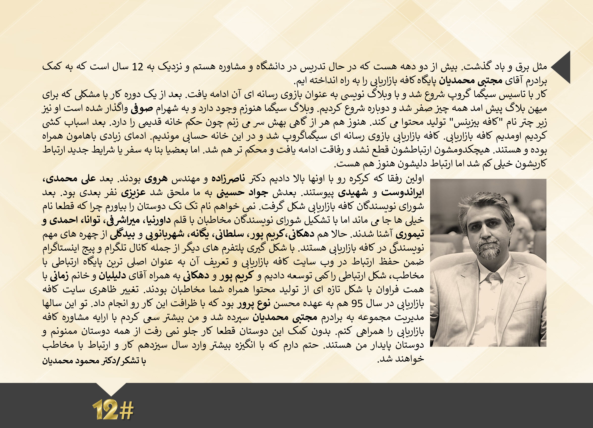 اولین رفقا که کرکره رو با اونها بالا دادیم دکتر ناصرزاده و مهندس هروی بودند. بعد علی محمدی، ایراندوست و شهیدی پیوستند. بعدش جواد حسینی به ما ملحق شد عزیزی نفر بعدی بود. بعد شورای نویسندگان کافه بازاریابی شکل گرفت. نمی خواهم نام تک تک دوستان را بیاورم چرا که قطعا نام خیلی ها جا می ماند اما با تشکیل شورای نویسندگان مخاطبان با قلم داورنیا، میراشرفی، توانا، احمدی و تیموری آشنا شدند. حالا هم دهکانی،کریم پور، سلطانی، یگانه، شهربانویی و بیدگلی از چهره های مهم نویسندگی در کافه بازاریابی هستند. با شکل گیری پلتفرم های دیگر از جمله کانال تلگرام و پیج اینستاگرام ضمن حفظ ارتباط در وب سایت کافه بازاریابی و تعریف آن به عنوان اصلی ترین پایگاه ارتباطی با مخاطب، شکل ارتباطی را کمی توسعه دادیم و کریم پور و دهکانی به همراه آقای دلیلیان و خانم زمانی با همت فراوان با شکل تازه ای از تولید محتوا همراه شما مخاطبان بودند. تغییر ظاهری سایت کافه بازاریابی در سال ۹۵ هم به عهده محسن نوع پرور بود که با ظرافت این کار رو انجام داد. تو این سالها مدیریت مجموعه به برادرم مجتبی محمدیان سپرده شد و من بیشتر سعی کردم با ارایه مشاوره کافه بازاریابی را همراهی کنم. بدون کمک این دوستان قطعا کار جلو نمی رفت از همه دوستان ممنونم و دوستان پایدار من هستند. حتم دارم که با انگیزه بیشتر وارد سال سیزدهم کار و ارتباط با مخاطب خواهند شد.
