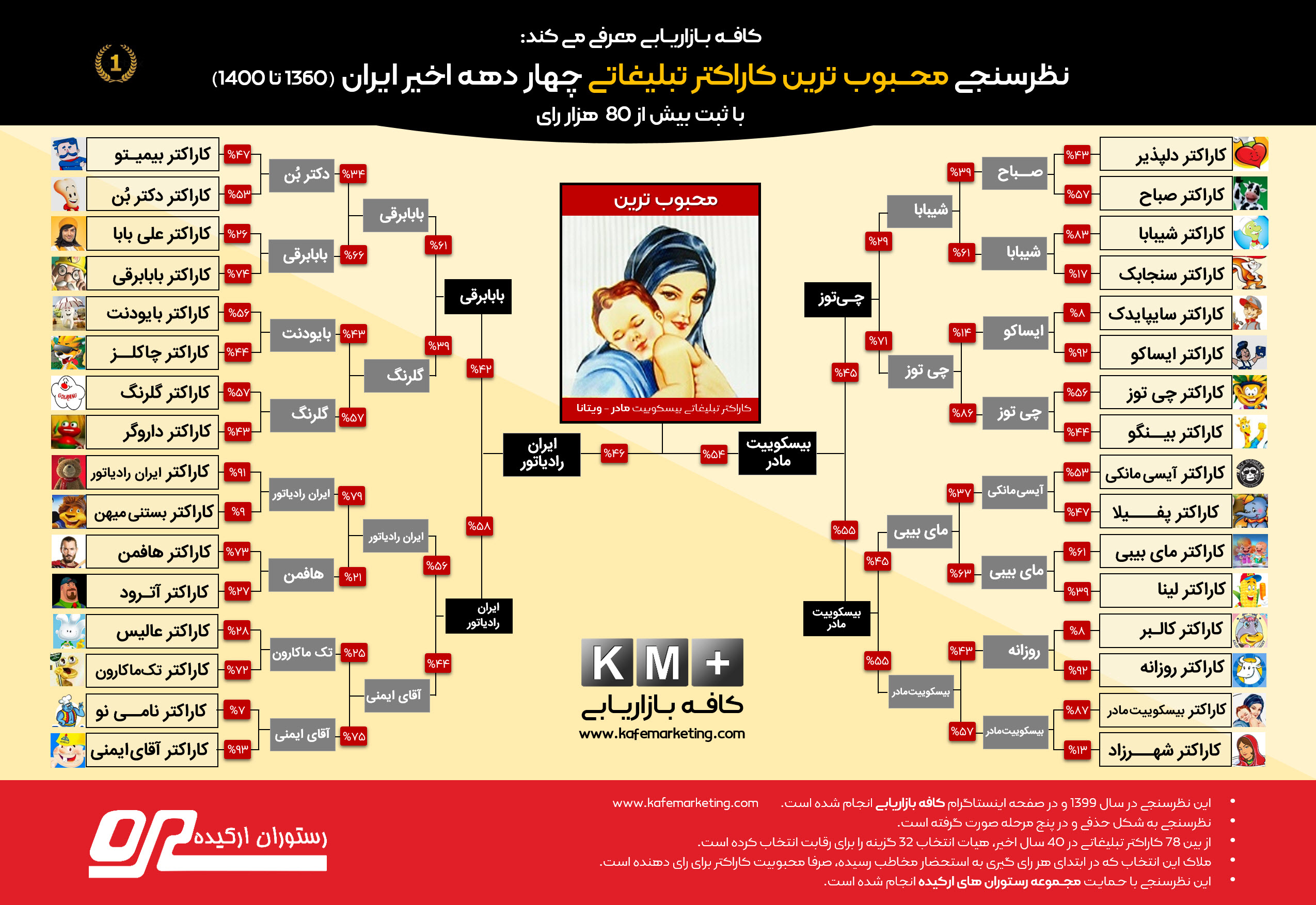 دوستان و همراهان عزیز کافه بازاریابی پس از یک رقابت یک ماهه بالاخره محبوب ترین کاراکتر تبلیغاتی چهار دهه اخیر ایران مشخص شد. کاراکتر بیسکوییت مادر (محصولی از ویتانا) نهایتا از سوی مخاطبان کافه بازاریابی به عنوان محبوب ترین کاراکتر تبلیغاتی (مسکات) چهار دهه اخیر ایران انتخاب شد. در این رقابت ابتدا ۷۸ همکاری شناسایی شد که ۳۲ مسکات یا کاراکتر تبلیغاتی از سوی هیات انتخاب جهت بخش رقابت انتخاب شدند. این نظرسنجی در استوری پیج اینستاگرام کافه بازاریابی انجام شد. در ابتدای هر نظرسنجی به مخاطب اطلاع رسانی در مورد ملاک انتخابها صورت گرفت.
