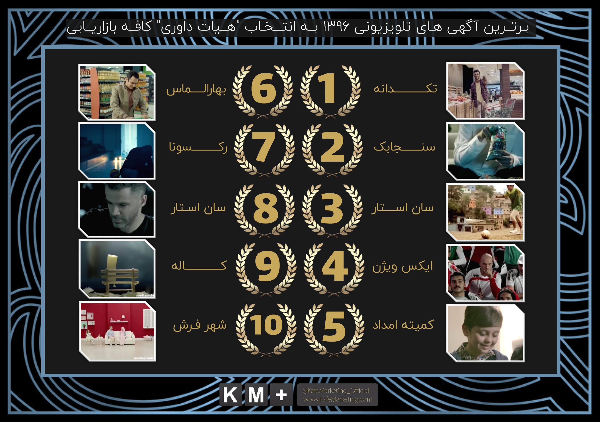 همراهان خوب کافه بازاریابی، امسال و برای سومین سال پیاپی با انتخاب برترین آگهی های تلویزیونی سال ۹۶ با شما همراه هستیم. برندگان این بخش از میان ۲۵ اثر برگزیده شده اند. در این مسیر دوستان زیادی به ما کمک کرده اند که جا دارد از تک تکشان تشکر کنیم. بدون توضیح اضافه برویم سراغ نتایج.