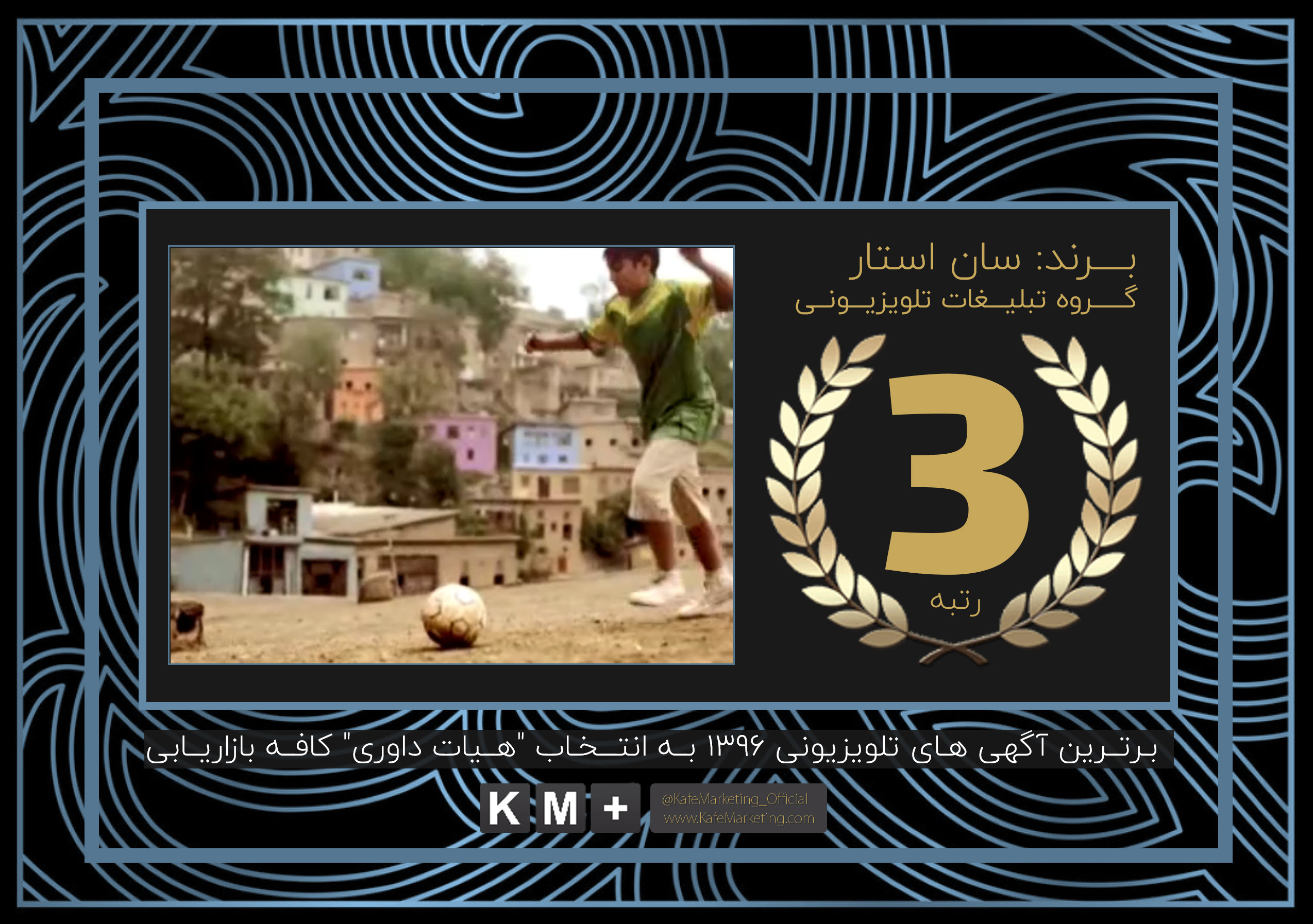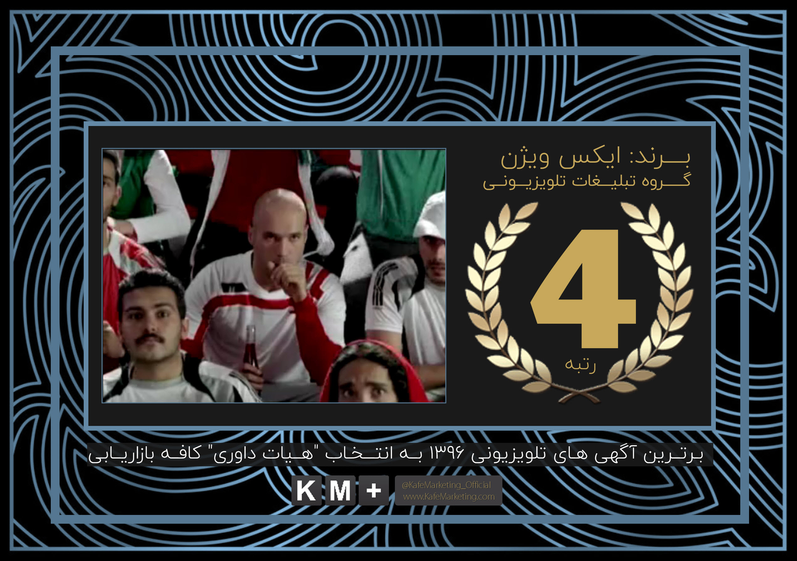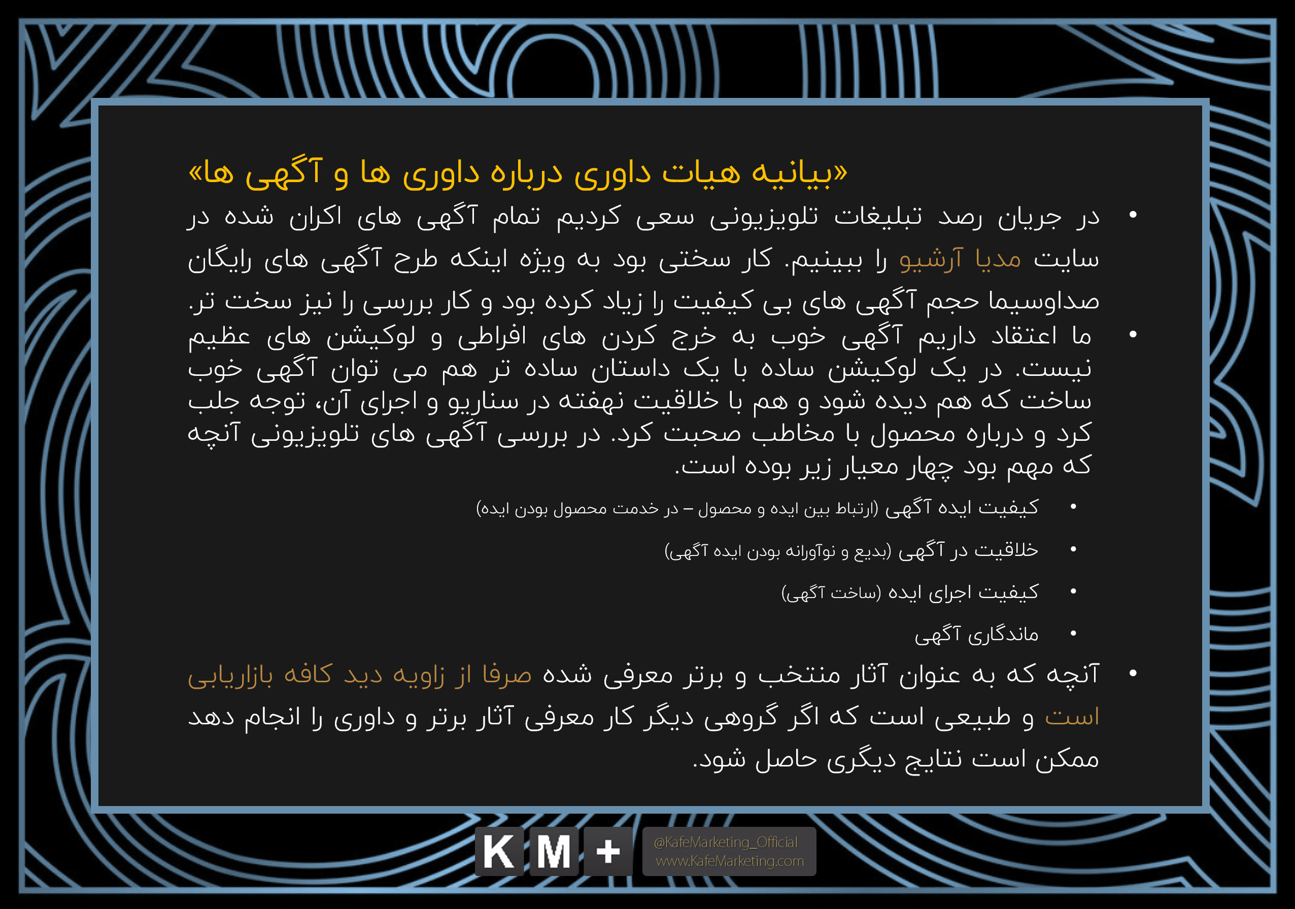 همراهان خوب کافه بازاریابی، امسال و برای سومین سال پیاپی با انتخاب برترین آگهی های تلویزیونی سال ۹۶ با شما همراه هستیم. برندگان این بخش از میان ۲۵ اثر برگزیده شده اند. در این مسیر دوستان زیادی به ما کمک کرده اند که جا دارد از تک تکشان تشکر کنیم. بدون توضیح اضافه برویم سراغ نتایج.