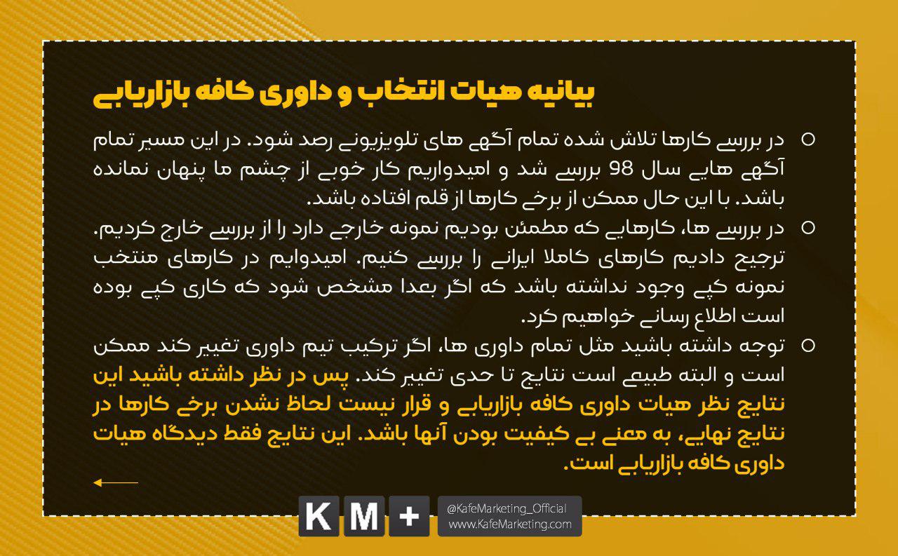 شایان ذکر است این فرایند کاری زمانبر است و همت همه داوران را در این مسیر باید ستود. در ادامه با هم نتایج آگهی تلویزیونی این داوری ها را ببینیم.