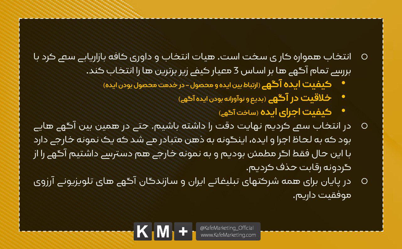 شایان ذکر است این فرایند کاری زمانبر است و همت همه داوران را در این مسیر باید ستود. در ادامه با هم نتایج آگهی تلویزیونی این داوری ها را ببینیم.