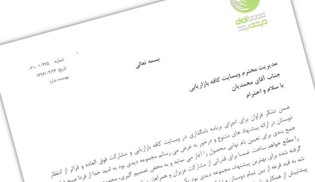 دوستان عزیز تشکر از تمام شما که در فراخوان پیشنهاد نام برای “ماشین پرو لباس” شرکت کردید. طبق اعلام قبلی راس ساعت ۲۴ سه شنبه امکان ثبت پیشنهاد نام به پایان رسید. طبق رسم کافه بازاریابی یادداشت از دسترس خارج شد. نامه رسمی مجموعه “دیدی بود” در پی فراخوان نام […]