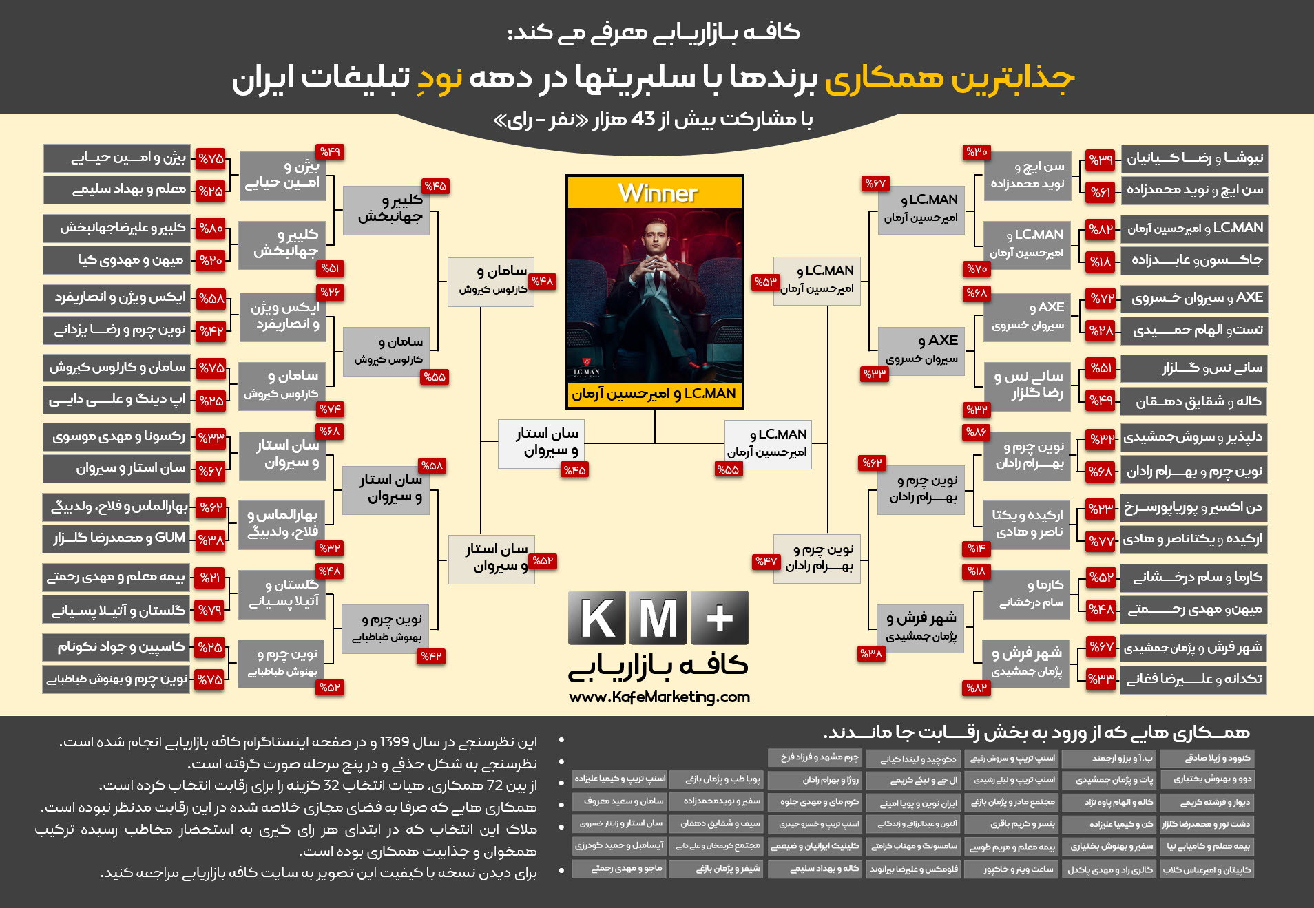 دوستان و همراهان عزیز کافه بازاریابی پس از یک رقابت یک ماهه بالاخره منتخب مردمی جذابترین همکاری برندها با سلبریتها در دهه نودِ تبلیغات ایران مشخص شد. امیرحسین آرمان و ال سی من نهایتا از سوی مخاطبان کافه بازاریابی به عنوان جذابترین همکاری برندها و سلبریتی ها انتخاب شد. در این رقابت ابتدا ۷۲ همکاری شناسیایی شد که ۳۲ همکاری از سوی هیات انتخاب جهت بخش رقابت انتخاب شدند. نکته مهم این که همکاری هایی که صرفا به فضای مجازی خلاصه شده در این رقابت مدنظر نبوده است. همچنین در ابتدای هر نظرسنجی به مخاطب اطلاع رسانی در مورد ملاک انتخابها صورت گرفت ترکیب همخوان و جذابیت همکاری به عنوان دو معیار اصلی برای رای گیری تعیین شده بود.