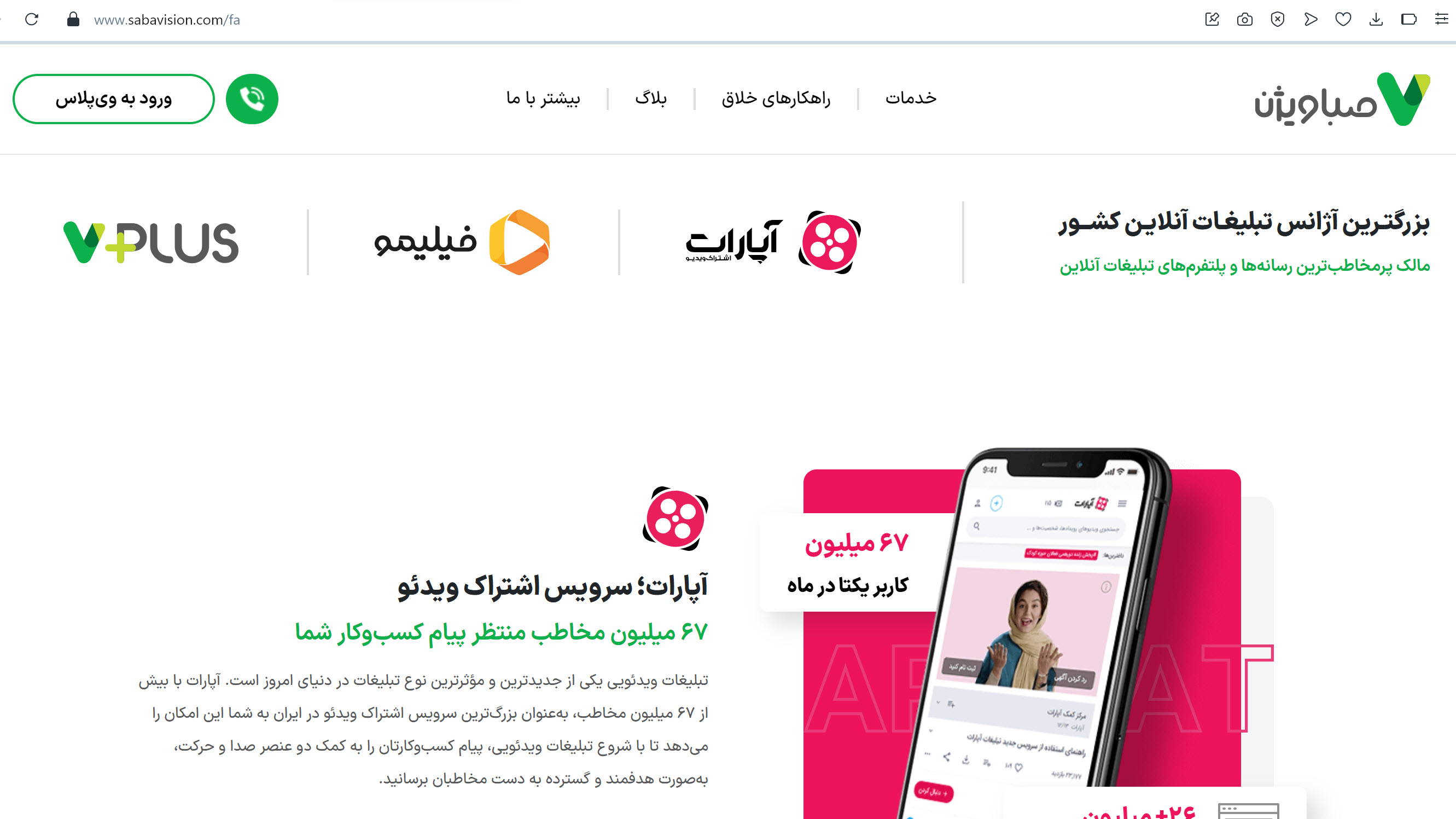 کم ادعایی نیست که یک شرکت، خود را بزرگترین شرکت تبلیغات آنلاین ایران معرفی کند. از صباویژن بر می آید. یک شرکت قدرتمند که از مجموعه بزرگ صباایده نیرو گرفته و در سال ۱۳۸۵ راهاندازی شده است. کار با صباویژن کار با حرفه ای هاست. در سبد این برند شما می توانید طیف وسیعی از خدمات را پیدا کنید. مالکیت سرویس هایی مثل آپارات و VOD فیلیمو هم گل سرسبد خدمات این شرکت است. فیلیمو هم بزرگترین VOD ایران است. صباویژن پلتفرمها هوشمند ویپلاس را هم به وجود آورده است. به نوعی با شرکتی سروکار دارید که علاوه بر ارایه خدمات دیجیتال، خالق و صاحب رسانه است. صاحب رسانه بودن یعنی صاحب مخاطب بودن. شما مزیتی این چنین در هیچ شرکت دیگری پیدا نمی کنید. تمرکز صباویژنی ها تبلیغات بنری، همسان، فیلیمو و آپارات است. برای شروع بررسی مجموعه صباویژن از این لینک شروع کنید.