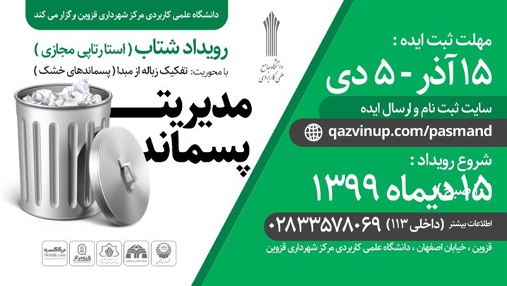 رویداد آنلاین شتاب استارتاپی با هدف «استفاده از فرصت فناوری ها در عرصه پسماند»، ۱۵ دیماه ۱۳۹۹ در دانشگاه علمی کاربردی مرکز شهرداری قزوین برگزار میشود.
