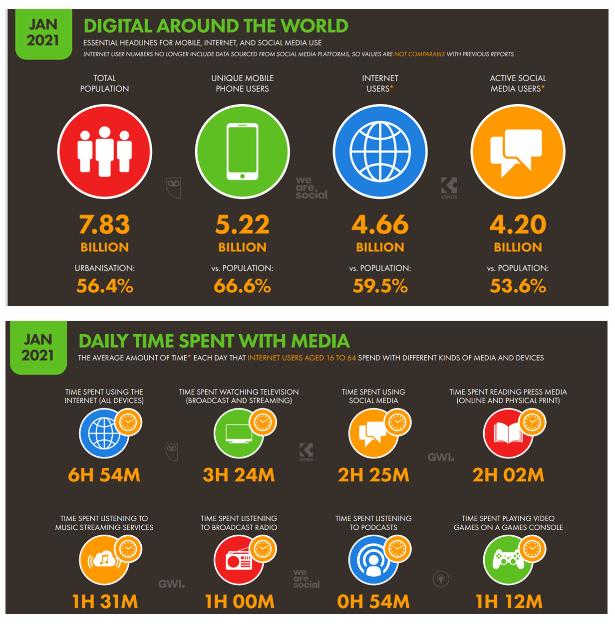 براساس آخرین گزارش موسسه ی هات سوئیت از تعداد ۴٫۶۶ میلیارد کاربر اینترنت ۴٫۲۰ میلیارد کاربر شبکه های اجتماعی داریم که نشان دهنده ی این است که تقریبا تمامی کاربران اینترنت عضوی از یک شبکه ای اجتماعی هستند این آمار را کنار آماری بگذاریم که بیش از ۷۰ درصد کاربران شبکه های اجتماعی اخبار و اتفاقات روز را از این شبکه ها دنبال می کنند.