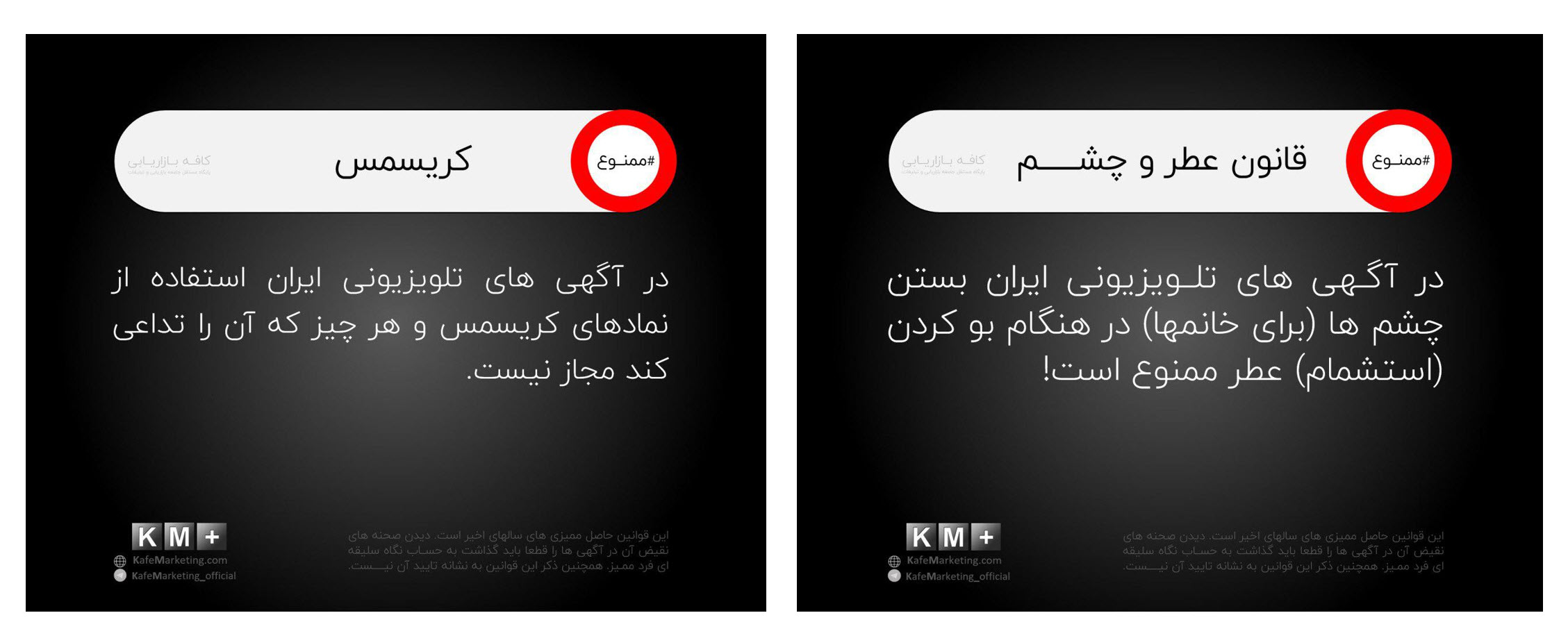 بخشی از ممیزی های سلیقه ای تلویزیون ایران ( برای مشاهده باقی این قوانین نانوشته هشتگ ممنوع را در کانال کافه بازاریابی دنبال کنید.)