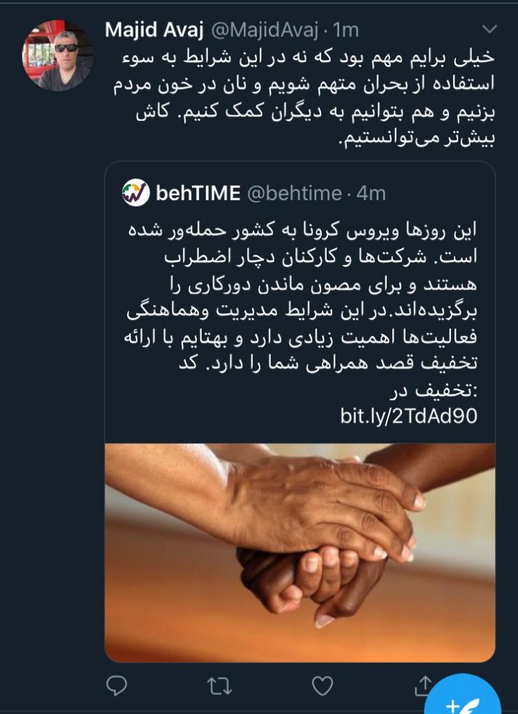 توییت زیر که در روز دوشنبه توسط مجید آواج منتشر شده، مصداقی بر این موضوع است. وی صاحب برند به تایم است و تصمیم گرفته اند با توجه به شرایطی که برای بیزنس ها به وجود آمده به آنها تحفیفی جهت استفاده از خدماتشان ارائه ب=دهند. معمولا صاحبان برند از این نگران هستند که مخاطبان آنها را به فرصت طلبی و سواستفاده از بحران متهم نکنند!